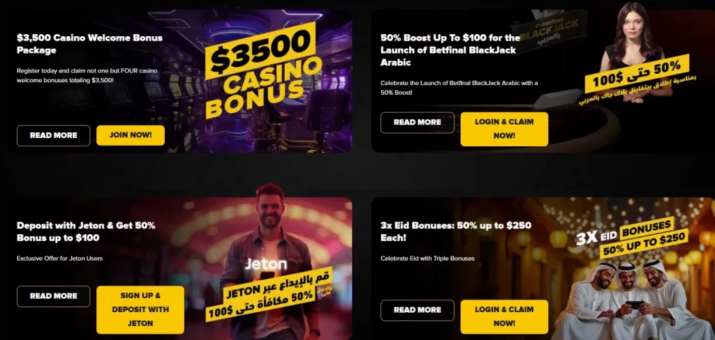 Betfinal casino is one of the more established offshore operators serving players across the Middle East. Its structure is unusual for the region: instead of marketing a single casino bonus, Betfinal builds a layered system that separates casino play, blackjack and sports betting into different onboarding paths.
